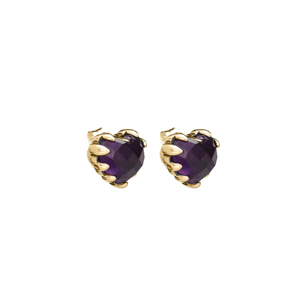 Stolen Girlfriends Club. The Love Claw Earrings reimagined with our exclusive dark amethyst stone. Our new bespoke setting gives a darker treatment to this naturally light purple stone - facet-cut into heart shapes and cast in a solid sterling silver setting with 18k gold plating. This pair of tough-yet beautiful stud-style embodies loving and healing properties for it's wearer.